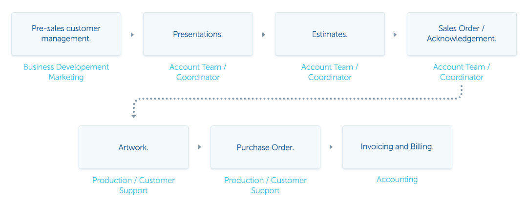 Grab a pen and paper and sketch out all the systems you currently use. Don’t forget to include your quoting system, your art management system, your ERP, your CRM, your accounting package, and even your task management tools. Create a map like the image below. The blue arrows represent the flow of the project.