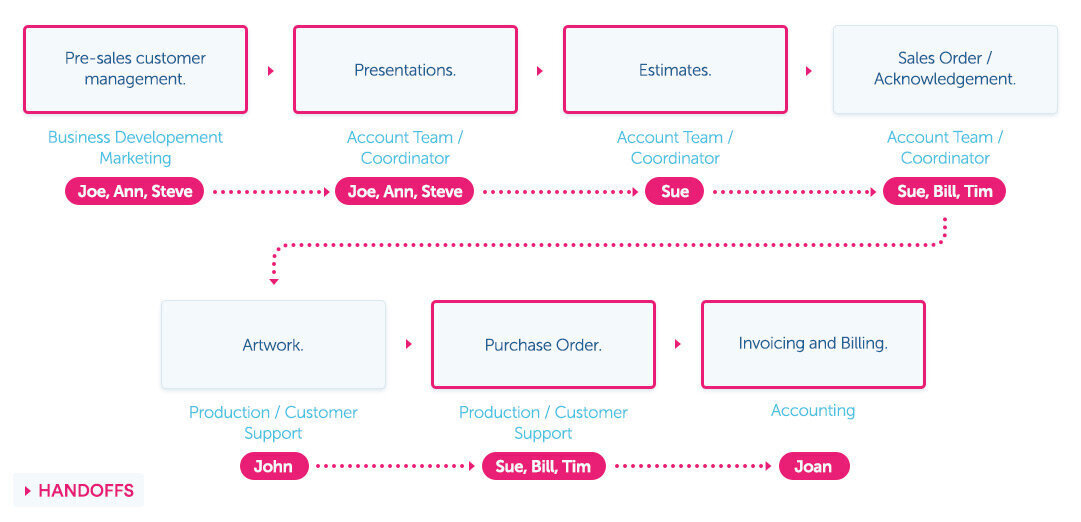 Now include the names of your colleagues in those departments. Draw an arrow between each handoff. A handoff is where you and your team transfers information from one system to another to move the project along. This might be from a quote system to a purchase order system, or from a purchase order to an accounting system. Handoff’s are bottlenecks.