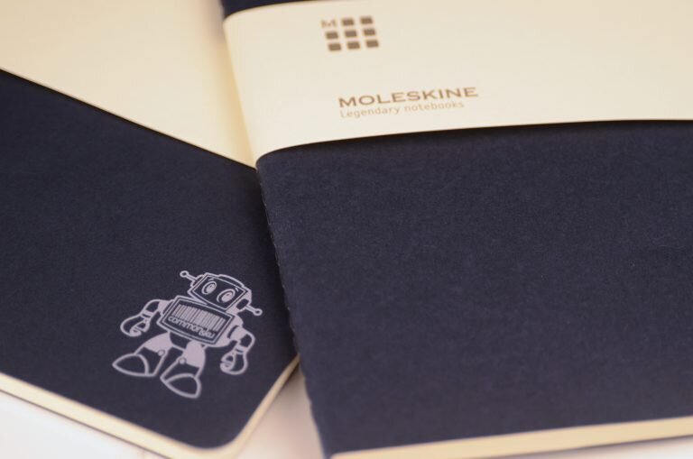 The good people at Gemline helped us out with these beautiful Moleskine Cahier Journals (style 40485). Wendy Farrell executed brilliantly as usual. I loved the matte grey skubot printed (with perfect detail – hard to do with the barcode)