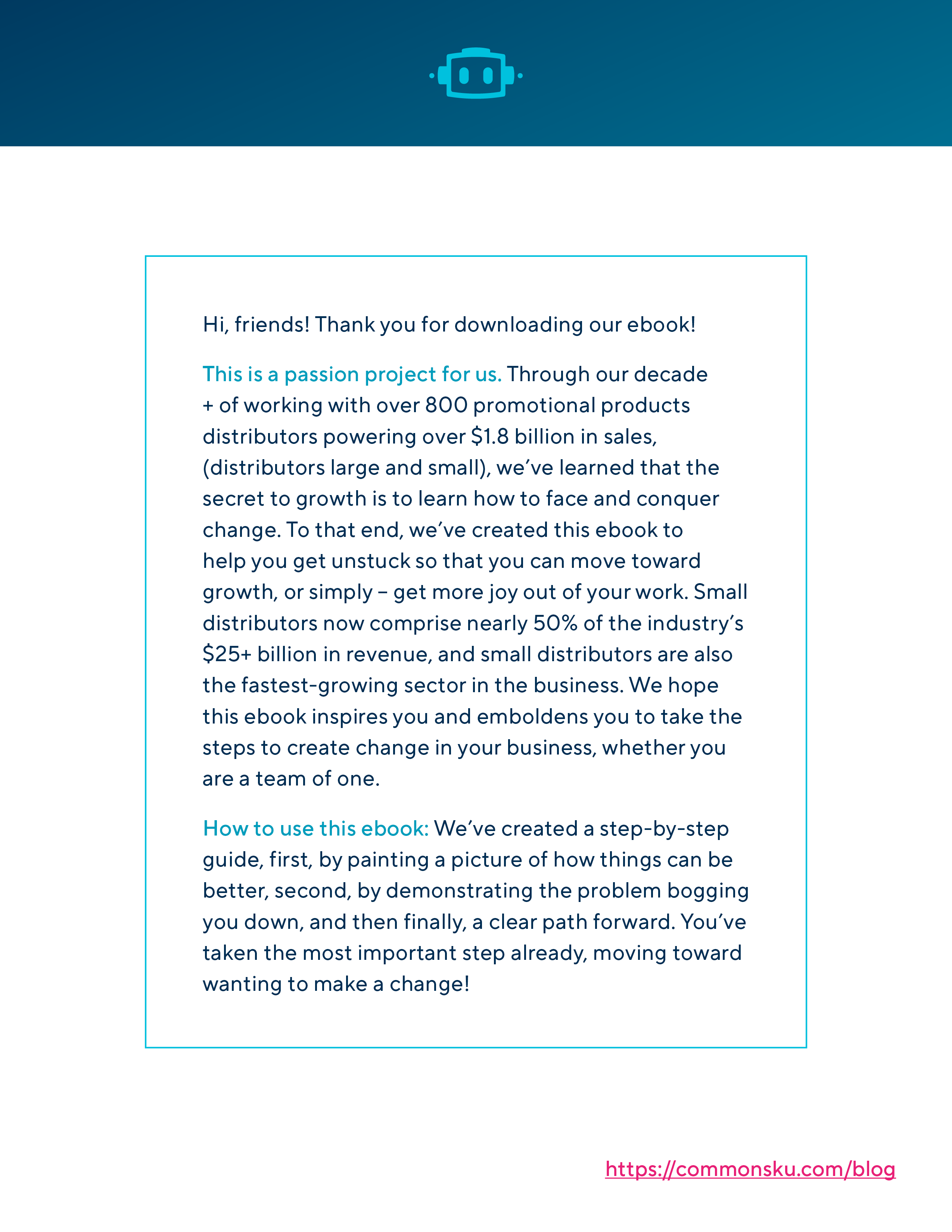This eBook is structured as a guide to assist accounting departments in transitioning to the commonsku platform. The guide is divided into four main parts: