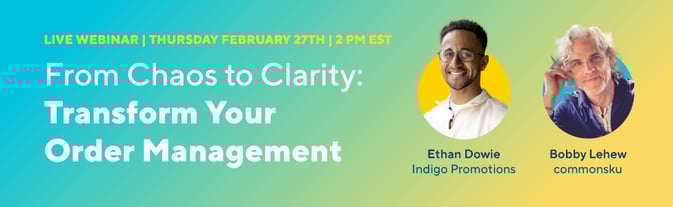 Is your order management process a tangled mess? Does it seem like you're drowning in tasks that are consuming your creative time? Are you constantly haunted by the fear of dropped details on orders? And when a team member is absent, does their workload become the Bermuda Triangle of lost orders and stalled progress? Join us as we talk with Ethan Dowie, the customer-obsessed CEO of Indigo Promotions, a fast-growing branded merchandise agency based in New York. At just 23, he launched Indigo from the ground up and has since partnered with industry giants like Google, MAC Cosmetics, Bloomberg, Boston Beer, and VOX Media. We’ll chat with Ethan about how commonsku has transformed his biz and skyrocketed his growth, sign up here!
